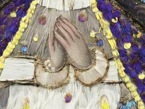 Meine erste Assoziation, wenn ich die Federmadonna betrachte, ist: Diese Farben, dieses Weiß und Türkis, erinnern mich an den Indianerschmuck, den wir früher zu Fasching getragen haben. Das Bild wirkt auf mich mehr indianisch als christlich. Es ist traurig, was der Kolonialismus und die Missionierung angerichtet haben: dass diese großartige Federkunst der Azteken für solche christlichen Motive genutzt wurde, dass das in so einem Mischmasch endet. Das zeigt die Madonna auf eine sehr plakative Weise.