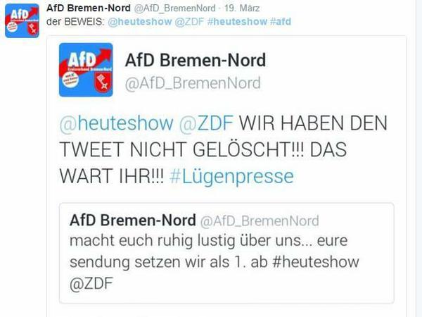 Auf Twitter reagierte der Account „AfD Bremen-Nord“ mit „macht euch ruhig lustig über uns...eure sendung setzen wir als 1. ab #heuteshow @ZDF“. Zu weit ging allerdings nicht die ZDF-Sendung, wie auch der Verfasser des Tweets erkannte, denn auf Twitter und Facebook löste die Botschaft neuen Hohn und Spott aus. Kurzerhand wurde sie gelöscht.