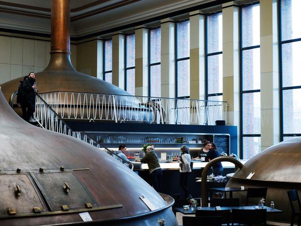 Und plötzlich ist alles ganz ruhig. Obwohl Musik über die Lautsprecher tönt – Männerstimme mit Gitarre –, obwohl man in der Mitte eines Sudhauses steht – hohe Decken, kahle Wände, Kupferkessel –, hier hallt nichts. Im Gegenteil. Es ist, als käme man in eine andere, wohligere Welt, wo einem vorher gar nicht aufgefallen war, was da alles rauschte und schrie. Bis man durch die große Eingangstür „König Otto“ betritt.