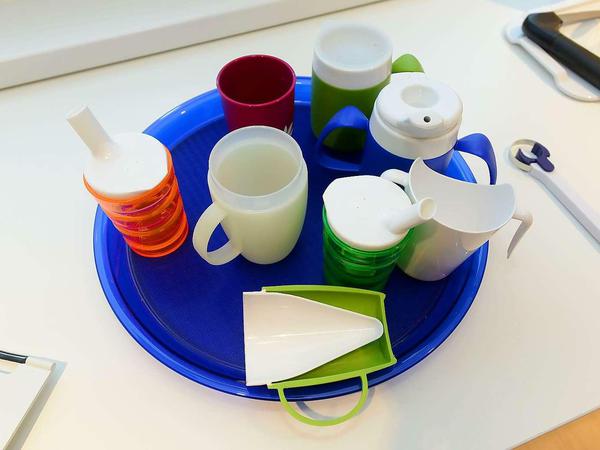 88 technische Lösungen sind in der Musterwohnung verbaut. Oder stehen herum wie die Plastiksektkelche, die farblich für schwache Augen gestalteten Teller oder die Nasentassen. Die hat Wolfgang Böhringer, der quirlige pensionierte Maschinenbauingenieur aus Mahlsdorf, besonders ins Herz geschlossen. Eine Einbuchtung für die Nase sorgt dafür, das die Tasse weiter nach oben gegen das Gesicht gekippt werden kann als herkömmliche Fabrikate. Da muss der steife Nacken nicht mehr mithelfen.