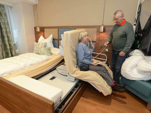 Böhringer ist mit seiner Frau gekommen, die mal in der Badewanne probesitzt und auch die elektrische Bettmechanik testet. Mit dem Ergebnis, dass ihre Beine zu kurz sind. Oder die Mechanik. Die Matratze lässt sich in alle gewünschten Liege- und Sitzpositionen verbiegen, schwenkt um 90 Grad und entlässt ihren Bestimmer auf Wunsch in die Vertikale. Die Besucher lächeln und blicken doch reserviert auf diesen summenden Aufstehgehilfen.