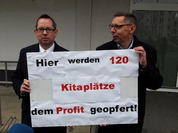 Oliver Igel (SPD), Chef des Bezirksamtes Treptow-Köpenick, und sein Sozialstadtrat Gernot Klemm (Linke) haben sich vor einem ehemaligen Supermarkt in Oberschöneweide postiert. Hier sollte eigentlich im nächsten Sommer eine neue Kita aufmachen. Der Senat hatte 1,2 Millionen Euro Fördermittel für den Umbau zugesagt, ein Vor-Mietvertrag war unterschrieben, der Umbau hätte im Juli starten sollen, doch kurz vor der Schlüsselübergabe machte der Eigentümer einen Rückzieher. „Ich habe mich richtig, richtig, richtig geärgert“, sagt Gernot Klemm. Er vermutet, dass auf dem Grundstück jetzt Wohnungen gebaut werden sollen. Das bringt erheblich mehr Geld ein.