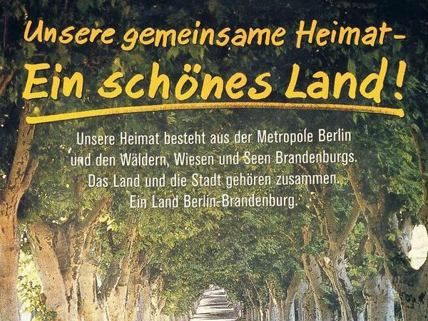 Das war der falsche Ton. Andere Plakate warben mit Brandenburger Alleen – die zeigten in Wahrheit aber Aufnahmen aus Frankreich. Es war nicht die einzige Panne der Fusionskampagne. Zwar gab es in Berlin eine Mehrheit für das gemeinsame Land, aber das reichte nicht. Erst nach einer längeren Phase gegenseitiger Schuldzuweisung und Ratlosigkeit wagten beide Länder einen neuen Versuch.