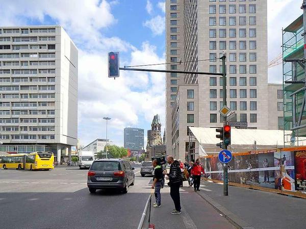 Die Kreuzung ist derzeit besonders unübersichtlich und eng, weil die Passage entlang der Joachimsthaler Straße abgerissen wird. Vor der Baustelle gibt es nur noch eine überbreite Fahrspur.
