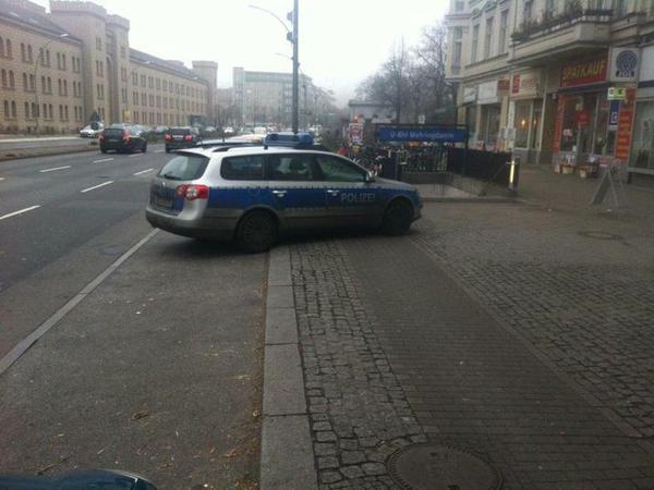 Wenn dann noch kurz vor dem U-Bahnhof Mehringdamm ein Streifenwagen den Weg versperrt, ist der Ärger groß. Quer auf dem Radweg steht er, obwohl offenbar auf dem Parkstreifen daneben gleich Platz für einen ganzen Tanklaster gewesen wäre. Leider hat Christian Müller den Fahrer nicht angetroffen, um ihn nach dem Grund zu fragen. Er konnte nur dieses Foto machen, den Kopf schütteln und das Fahrrad vorbeischieben.