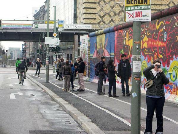 An der East Side Gallery bleibt fast jeder Tourist für ein Foto stehen. Radfahrer werden kurz vor der Oberbaumbrücke direkt in diese Situation geführt. Wer dagegen vor den Trauben unachtsamer Touristen auf die Straße ausweicht, wird angehupt, hautnah überholt oder wild gestikulierend auf den kaum nutzbaren Radweg verwiesen.