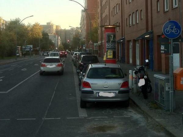 Diese Situation kennt jeder Radfahrer, egal in welchem Stadtteil: Überall gibt es Wege, die aus verschiedenen Gründen kaum zu befahren sind. Was aber meistens untergeht: 85 Prozent der Berliner Radwege sind nicht mehr benutzungspflichtig, so auch hier: Das blaue Schild wurde abgeschraubt. Den meisten Radfahrern fällt das erst spät oder gar nicht auf. Viele fahren sogar freiwillig oben weiter, um nicht von Autofahrern drangsaliert zu werden. Bereinigt würde diese Situation erst, wenn die entwidmeten Radwege verschwinden, also rückgebaut werden.