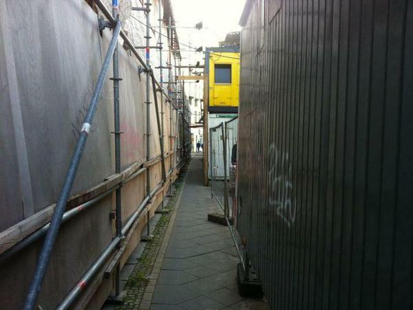 Würden Sie in diesen Tunnel fahren? Es sieht fast aus, als könne man dort stecken bleiben, auch ohne Gegenverkehr. Dabei ist die Schönhauser Allee nicht nur für Autofahrer eine zentrale Nord-Süd-Verbindung in der Innenstadt. Radfahrer müssen sich seit einer Sanierung in den Neunziger Jahren auf einem handtuchbreiten Radweg auf dem Bürgersteig entlang kämpfen - immer wieder klassisch übersehen von Abbiegern, den Weg kreuzenden Fußgängern und ausgebremst von Fahrradkorsos der Touristen. Vor diesem Hintergrund bildet diese bizarre Baustelle auf dem Radweg ungefähr das negative Grundgefühl von Radfahrern auf der Schönhauser ab.