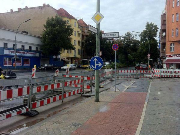 Wie ein Aal in der Reuse müssen sich Radfahrer an dieser Baustelle in der Sonnenallee vorkommen. Erst von links ein Bauzaun, der an der nächsten Ecke eine scharfe Rechtskurve in die Ederstraße schlägt und Radlern den Weg abschneidet. Obwohl laut Radverkehrsstrategie des Senats Radfahrer an Baustellen "sicher und ohne Zwang zum Absteigen" vorbeigeführt werden sollen, beobachten unsere Leser diese Situation fast regelmäßig an Baustellen im ganzen Stadtgebiet. Oft fließt der Kraftverkehr weiter, während Radfahrer massiv behindert werden. Es "sind ihnen keine größeren Einschränkungen zuzumuten, als anderen Verkehrsteilnehmern", heißt es vom Senat.