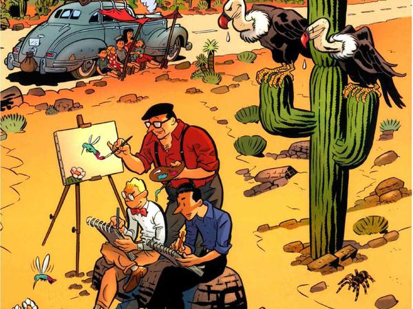 In „Gringos Locos“ zeichnet Olivier Schwartz nach einem Szenario von Yann die Amerika-Reise der belgischen Comic-Künstler Jijé, Franquin und Morris nach. Jene drei Schwergewichte des europäischen Comics brachen im Jahre 1948 in der Hoffnung auf, ein Engagement in den kalifornischen Walt-Disney-Studios zu bekommen. Von Rotterdam aus setzten sie nach New York über, um von dort aus mit einem altgedienten Ford Hudson einen Road Trip quer durch die Vereinigten Staaten bis nach Los Angeles hinzulegen – zu acht, Jijé hatte seine Frau und seine vier Kinder dabei.
