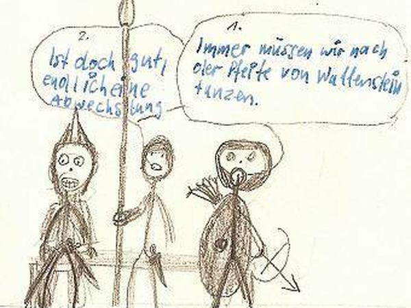 Als mittelalterlicher Landsknecht hatte man es nicht leicht. „Immer müssen wir nach der Pfeife von Wallenstein tanzen“, beklagt sich ein bewaffneter Kämpfer bei seinem Gefährten. „Ist doch gut, endlich eine Abwechslung“, entgegnet der. Die Szene hat der Achtklässler Alexander Wuttig gezeichnet, als Teil einer Bildgeschichte zum Dreißigjährigen Krieg. Er besucht die Heinrich-von-Stephan-Schule in Moabit und hat kürzlich mit seinen Mitschülern im Geschichtsunterricht historische Themen als Comic aufgearbeitet – im Rahmen eines Projekts, das seine Schule mit dem Deutschen Historischen Museum veranstaltet.