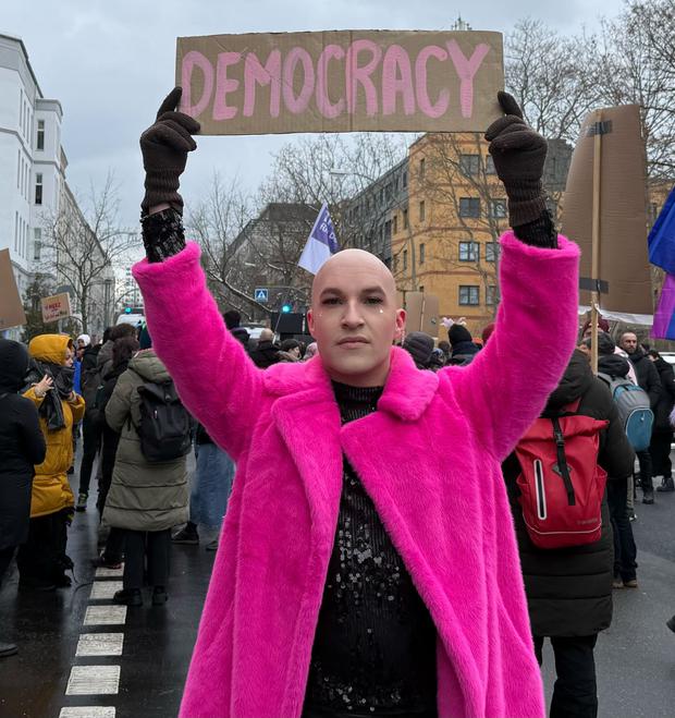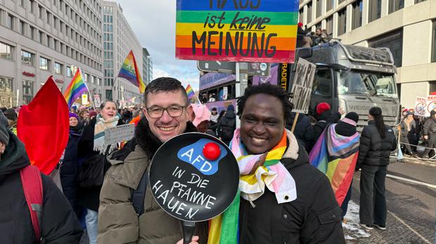 „Es ist wichtig heute zu demonstrieren, zu zeigen, dass sich die Community nicht spalten lässt“, sagte Stephan Jäkel (links) von der Schwulenberatung Berlin. „Wir sind hier und wir sind laut, um unsere Rechte und unsere Demokratie zu verteidigen.“