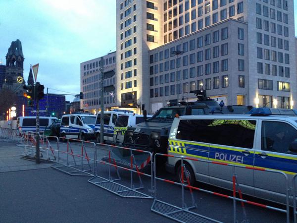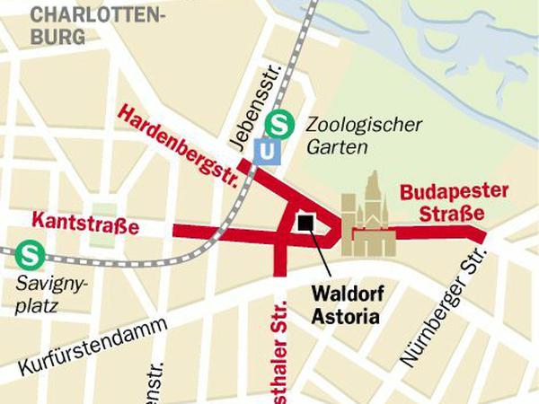 +++ Kein Durchkommen an der Hardenbergstraße. Die Polizei hat schon am Morgen den Bereich in einem Ring von 200 bis 300 Metern rund um das Waldorf Astoria gesperrt. Anders als gestern kommen heute selbst Fußgänger auf der Hardenbergstraße nicht mehr durch. Das Waldorf Astoria ist komplett abgesperrt. U-Bahn und S-Bahn fahren uneingeschränkt, einige Ausgänge im Sperrgebiet sind aber verriegelt - zum Beispiel der direkt vorm Zoopalast.