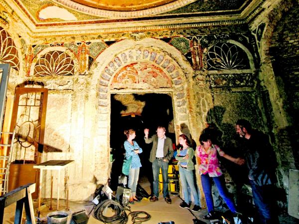 Hier und da findet sich noch ein Muschelabdruck, einige Stellen glitzern im Licht des Scheinwerfers. Die frühere Pracht der Muschelgrotte mit ihren Mosaikornamenten im Neuen Garten – sie lässt sich erahnen, in der halb verschwundenen Deckenmalerei des Künstlers Bartolomeo Verona, den geschwungenen Nischen an den Seitenwänden und dem teilweise erhaltenen rautenförmig gemusterten Steinboden. Stück für Stück soll die alte Schönheit wieder vollständig hergestellt werden. Zunächst wird die Muschelgrotte erst einmal für die Besucher des Neuen Gartens sichtbar gemacht. Bis Ende August erhält sie historisch nachempfundene Fenster, die bei einem Schmied in der Domäne Dahlem hergestellt werden. „Die Grotte bekommt quasi ihre Augen wieder“, sagt Susanne von der Osten-Sacken, die Vorsitzende des Förderkreises Muschelgrotte im Neuen Garten. „Schließlich sollen die Besucher ruhig sehen, was für ein Juwel hier am Jungfernsee liegt.“