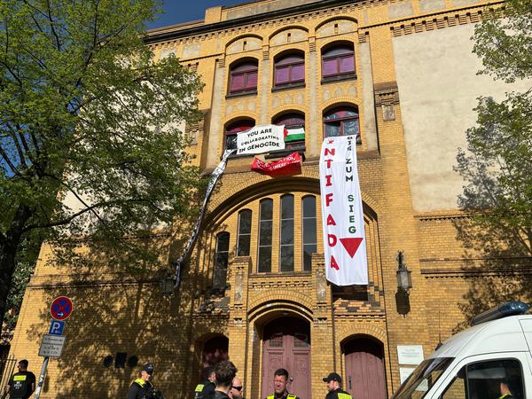 Der Hörsaal sei am Mittwoch gegen 14 Uhr besetzt worden, sagte eine Sprecherin der HU. Das Uni-Präsidium habe die Polizei um Räumung des Gebäudes ersucht, weil Fotos Sachbeschädigungen im Innenraum und an der Fassade dokumentierten. Auf Transparenten, Bannern und Schriftzügen wurden gewaltverherrlichende Parolen verwendet, das Existenzrecht Israels geleugnet sowie Symbole der Terrororganisation Hamas verwendet, teilte die HU-Sprecherin mit.