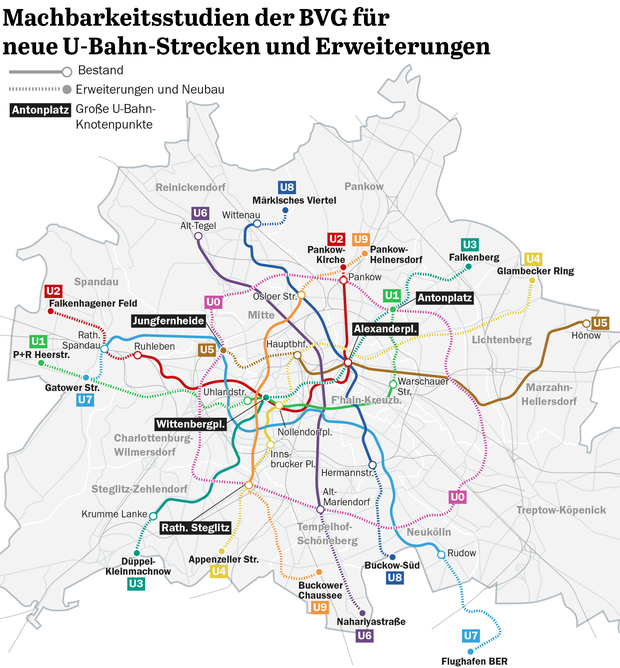 Wie berichtet, würde bei kompletter Umsetzung des Konzepts das heute knapp 150 Kilometer lange U-Bahn-Netz mehr als verdoppelt auf 318 Kilometer. Die BVG-Planer schlagen den Ausbau in drei Stufen vor, ohne einen Zeithorizont und Kosten zu nennen. Angesichts der bisherigen Erfahrungen wäre mindestens ein hoher zweistelliger Milliardenbetrag realistisch. Kritiker verweisen darauf, dass Straßenbahnstrecken etwa 90 Prozent billiger seien als neue U-Bahn-Tunnel.