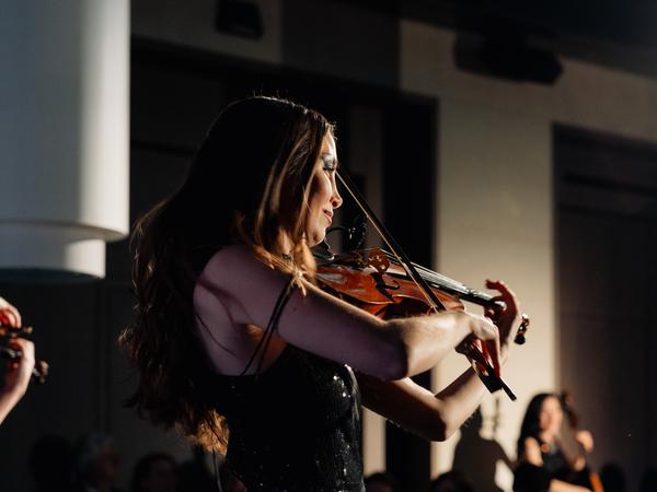 Das ist bereits seit Februar wieder hier im vollen Einsatz. Das Restaurant San Ena serviert seit Wochen feine griechische Spezialitäten mit Blick auf den Dom. An diesem Abend werden die neuen Konferenzräume mit einer Licht-Performance stilvoll in Szene gesetzt. Wandelnde Violinistinnen um Beatrix Löw-Beer begleiten die tanzenden Lichter musikalisch.