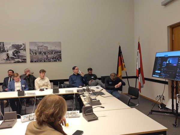 Der Anfang der Unterhaltung wird im Casino des Abgeordnetenhauses gestreamt, kurz nach Beginn des Neujahrsempfangs. Die AfD-Landesvorsitzende Kristin Brinker, der Vorsitzende der Jungen Alternative Berlin, Martin Kohler, mehrere Berliner Abgeordnete und rund 20 andere Gäste hören konzentriert zu, die restlichen Anwesenden unterhalten sich im Hintergrund weiter oder essen vom äußerst fleischlastigen Büfett.