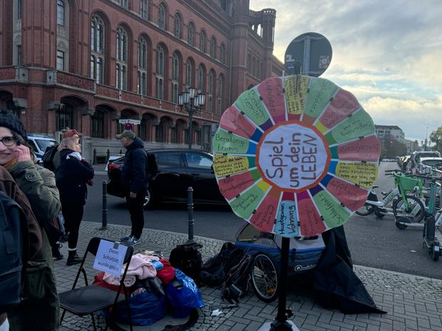 So kam es dann auch: Leere Klappstühle wurden vor dem Roten Rathaus aufgestellt. „Dieses Mittagessen wurde gekürzt“ war auf Zetteln darauf zu lesen, „Diese medizinische Sprechstunde würde gekürzt“. Und es gab ein Glücksrad. „Spiel um dein Leben“, steht darauf.