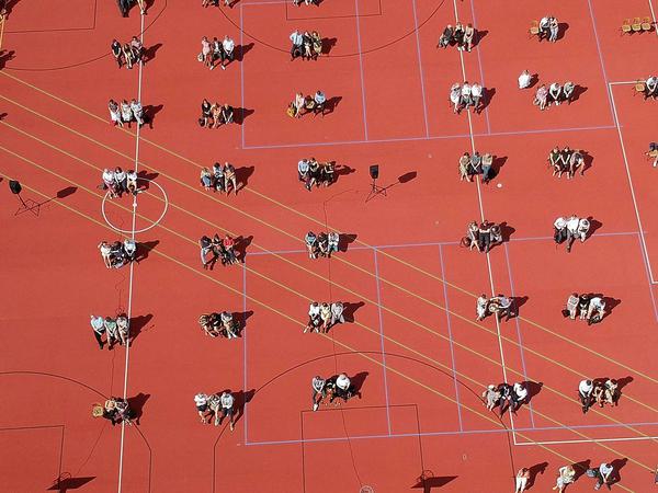 Jedes der 72 Inselchen steht für einen Abiturienten oder eine Abiturientin und ihre Begleitung: Zwei Personen darf jeder mitbringen, solange diese im selben Haushalt wohnen und zuvor über eine Excel-Tabelle angemeldet wurden. Linas Eltern – ihr Geschwister durften nicht mitkommen – sitzen ziemlich weit hinten links, fast auf der Dreipunktelinie des Basketballfelds. Dorthin geht sie nun zurück, der Physik-Leistungskurs von Herrn Bolm wird bereits aufgerufen, ein paar Meter schreitet Lina noch über den roten Tartanboden, ihr buntes Kleid flattert im Wind, dann sind 13 Jahre Schulzeit beendet.