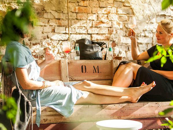 Ein ziemlich heißer Kandidat für den schönsten Aperitivo-Ort dieses Sommers ist das Café Bravo in den Höfen der „Kunst-Werke“. Denn der verglaste DanGraham-Pavillon liegt inmitten eines üppigen grünen Dschungels, in dem sich Gartenmöbel-Gourmets an den petrolgrünen Tischen des dänischen Herstellers „Hay“ erfreuen dürfen. Aperitivo gibt’s hier immer freitags. Das Konzept: Die Snacks stellt das Team von Mark Andre Pennock, der das Café noch bis inklusive Juli kulinarisch und gelegentlich auch kulturell mit Leben füllt. Die Wurst kommt von „Kumpel & Keule“ und „Vom Einfachen das Gute“, Käse von „Alte Milch“. Die Weine liefern Weinhändler im Wechsel. Zum nächsten Termin, am 28. Juni, bringt der Natur-Experte Olaf Schindler ein paar Flaschen aus dem aufstrebenden Weinland Georgien mit.