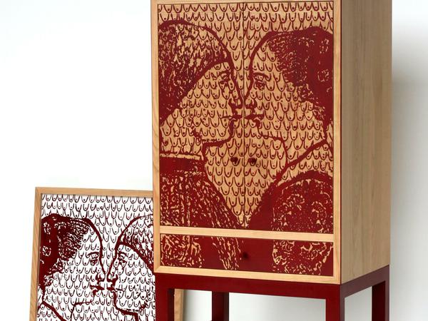 Dafür hat die Hutdesignerin Fiona Bennett extra ihren Laden ausgeräumt, der nicht passender für eine Ausstellung unter Coronabedingungen sein könnte. Schon durch die großen Schaufenster bekommt man einen guten Eindruck, was slowenisches Design auszeichnet: Funktion mit Schönheit zu verbinden, altes Handwerk neu zu interpretieren. So wie im Weinschrank von Vulgaris Woodcut, dessen Türen mit einem Holzschnitt verziert sind. Die Motive fertigt die Designerin Nina Kozeji auf Papier, erst nach der Bestellung werden sie in das Kirschholz geschnitten.
