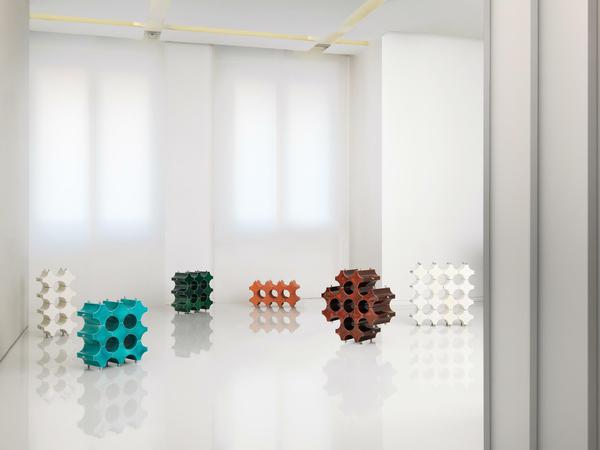 Das Weinregal Helga wiederum sieht aus, wie aus alten Keramik-Heizelementen neu zusammengefügt. Man kann es beliebig erweitern, so dass es auch als wabenförmiger Raumteiler funktioniert. Ausgedacht hat sich Helga das Architekturbüro Sadar + Vuga, eines der bekanntesten Sloweniens.