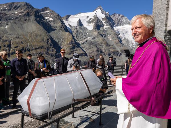 Der österreichische Gletscher Pasterze sei der „menschengemachten Klimakrise zum Opfer gefallen“, so die Aktivisten. Kirchliche Vertreter beteiligten sich an der Aktion.