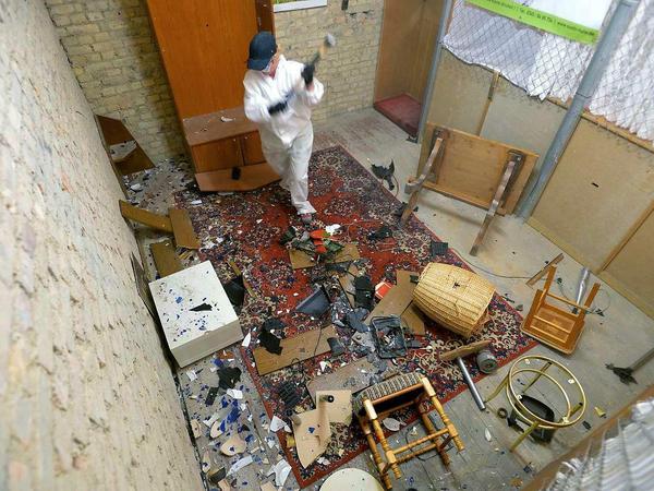 3. DER RAUSCH: Angeblich kommt irgendwann der Rausch - der Drang, alles kurz und klein zu hacken, befeuert von passender Musikdröhnung und vielleicht manchen Gedanken: an Arbeit, Kollegen, untreue Geliebte oder verständnislose Ehepartner. „Man hat auf jeden Fall eine Adrenalinausschüttung. Ich würde es vergleichen mit anderen verrückten Sachen wie Bungee-Jumping oder Fallschirmspringen“, meint Mersch. „Man ist da wirklich in einem Rauschzustand und hat danach ein Glücksgefühl.“ Rauschzustand: ja. Eine Arbeit mit eigentümlichem Reiz, die man zu Ende bringen will. Unter den Schuhen knirschen Glasscherben, Nägel ragen aus den Resten von Brettern, feiner Staub wabert in der Luft. Erschreckend, wie leicht Zerstören geht, auch wenn immer mehr Muskeln zu spüren sind. Mach die Möbel fertig! Stress im Alltag, laut Mersch ein Hauptgrund, warum Kunden für 139 Euro bei ihm buchen. „Jeder kennt's, da hängt der Kopierer wieder, Papierstau. Und dann kann man endlich das Ganze bereinigen, auf andere Art.“ Ganz nach dem Motto: Gib's dem Computer - und denk dabei an die nervige Steuererklärung.