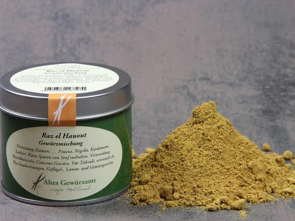 RAS EL-HANOUT Zu Deutsch: „Kopf des Ladens“. Mit der marokkanischen Mischung fing bei Ingo Holland alles an: Weil die fertigen Produkte gar nicht so dufteten und schmeckten, wie er sich das nach dem, was er gelesen hatte, vorstellte, nämlich fruchtig und floral – oft fehlten die Rosenblüten, die es ihm gerade angetan hatten –, begann der fränkische Sternekoch zu experimentieren. Die ersten Versuche, erzählt der 58-Jährige, landeten in der Mülltonne, waren zu bitter, „weil wir nicht wussten, dass Bockshornklee geröstet werden muss“. Den weißen Kardamom schmiss er wieder raus, weil er seiner Meinung nach doch nicht viel beizutragen hatte. Ein halbes Jahr hat es gebraucht, bis der Meister zufrieden war. Heute enthält seine Mischung Kichererbsen, Pfeffer, Veilchenwurzeln, Rosenblüten, Kurkuma, Galgant, Ebereschenbeeren, Cumin, Sternanis, Paradieskörner, Bockshornklee, Zimt, Orangenblüten, Lavendelblüten, Mönchspfeffer, Chili, Sellerie, Koriander, Gewürznelken, Macis, Fenchel, Piment, Nigella, Kardamom, Lorbeer. „Ein Allroundgewürz“, wie Holland schwärmt, für Lammbraten, Tajine, Couscous, ja sogar fürs Dessert. „Eine leicht warme, ja, pikante Note tut jedem Gericht gut, bringt Spannung rein.“ Man darf es nur nicht übertreiben, warnt auch Holland. Güngörmüs würzt gebratene Enten- oder Kalbsleber mit einer Prise Ras el-Hanout.