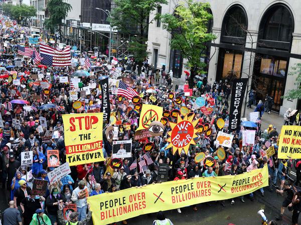 Bei der bisher größten Protestwelle gegen die Politik von Präsident Donald Trump sind Menschen quer durch die USA auf die Straße gegangen. Die Veranstalter sprachen von mehr als fünf Millionen Teilnehmern in über 2.100 Städten am Tag von Trumps Militärparade in Washington.