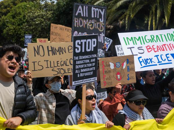 Immer wieder skandierten sie: „So sieht Demokratie aus“ und forderten die Absetzung Trumps, wie ein dpa-Reporter berichtete. Auf vielen Schildern wurde die Arbeit der Einwanderungspolizei ICE kritisiert, manche trugen Aufschriften wie: „Wenn ich einen Diktator will, dann frag' ich meine Katze.“