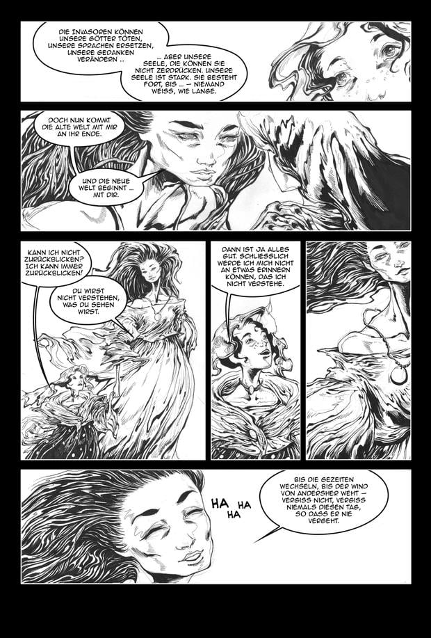 In opulenten schwarz-weißen Bleistift- und Tuschezeichnungen mit gelegentlichem Aquarell- und Rasterfolien-Einsatz vermitteln Autor Paolo Herras und Zeichner Jerico Marte eine Welt im Spannungsfeld zwischen Anpassung an die herrschenden Verhältnisse und Selbstbehauptung.