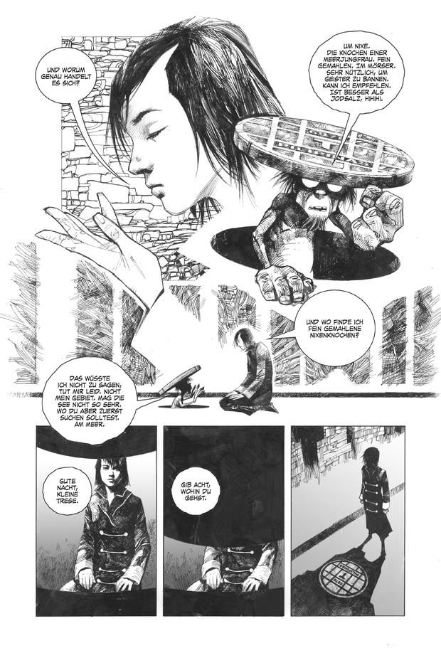 Der Comic mit dem wohl größten Wiedererkennungseffekt für ein breiteres Publikum ist die inzwischen auf drei Bände angewachsene Horror-Krimiserie „Trese“ (Übersetzung Jens R. Nielsen, je 144/184 S., je 18/20 €), deren dritter Band gerade auf Deutsch erschienen ist. Die Anime-Verfilmung der Reihe war vor einigen Jahren ein Netflix-Hit in zahlreichen Ländern, jetzt lassen sich die der Adaption zugrunde liegenden Geschichten von Budjette Tan (Story) und Kajo Baldisimo (Zeichnungen) hierzulande als Comic nachlesen.