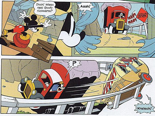 In deutscher Erstveröffentlichung folgt ein kurzer Beitrag von Floyd Gottfredson, welcher die Comic-Inkarnation der Figur maßgeblich definierte, gefolgt von einer neuzeitlichen Comic-Adaption des aus dem Jahr 1938 stammenden Trickfilms „Mickey's Trailer“ durch den bereits erwähnten Cèsar Ferioli Pelaez. Diese ist doppelt interessant, weil sie einen Vergleich mit der trickfilmbeeinflussten Iwerks-Geschichte zulässt, und dabei zeigt, wie Ferioli mittels Aufbrüchen im Seitenarrangement unter Einsatz von halboffenen Panels und der geschickten Nutzung von leeren Räumen in dynamischem Strich die Sprache des Animationsfilms in die des Comics überführt.