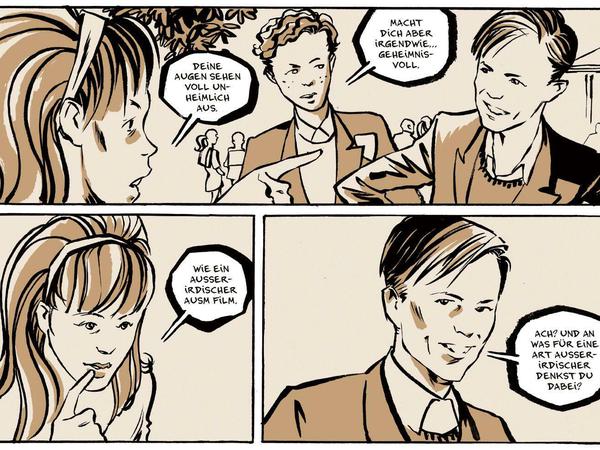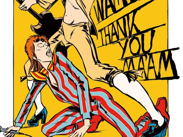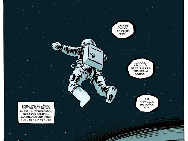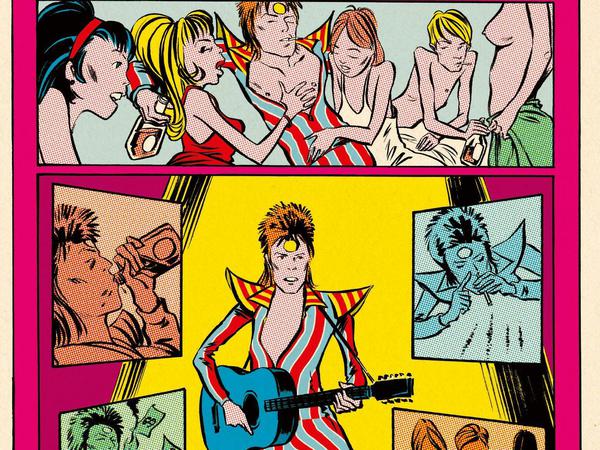 Dafür kombiniert Kleist unterschiedliche Zeichenstile, wie man sie in dieser Mischung von ihm noch nie gesehen hat. Song-Elemente wie die Passagen aus „Five Years“, dem Eröffnungsstück des wegweisenden Albums „The Rise and Fall of Ziggy Stardust and the Spiders from Mars“ von 1972, sind in einem Retro-Stil gezeichnet, der an Superheldencomics der späten 60er erinnert.