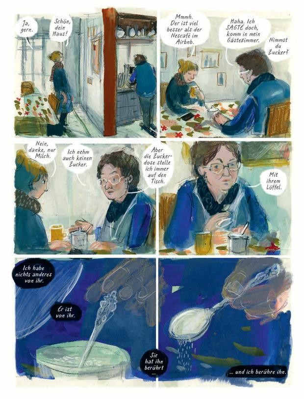 Die in München lebende Comiczeichnerin Barbara Yelin („Irmina“) hat Emmie Arbels Schilderungen ihrer Kindheit in vielschichtigen Aquarellbuntstift-Bildern zu Papier gebracht. Die dunklen Farben und die oft nur schemenhaft angedeuteten Details der historischen Sequenzen kontrastieren mit dem hellen, realistischen Strich, mit dem Yelin ihre Begegnung mit Arbel im Israel der Gegenwart festgehalten hat.