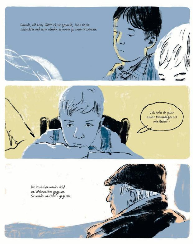 Anhand subtiler Abstufungen von Zeichenstil und Farben vermittelt er so unter anderem den Wechsel der Zeitebenen und zeigt, wo die Erinnerungen der beiden Brüder voneinander abweichen und wo sich ihre Perspektiven auf das ergänzen, was sie vor rund 80 Jahren erlebt haben.