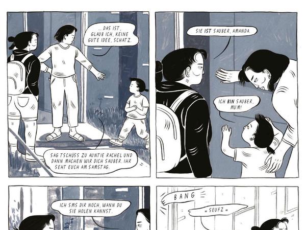 Visuell arbeitet Lai mit einer Dualität aus Struktur und Zeichnungen, die in einem besonderen Spannungsverhältnis stehen. Auf der einen Seite zieht sich die Panelaufteilung mit vier gleichen Rechtecken als fester Rahmen durch das Buch. Gepaart mit der gleichbleibend monochromen Kolorierung in Blau, vermittelt das eine gewisse Stabilität und gibt den Leser*innen optisch Halt.