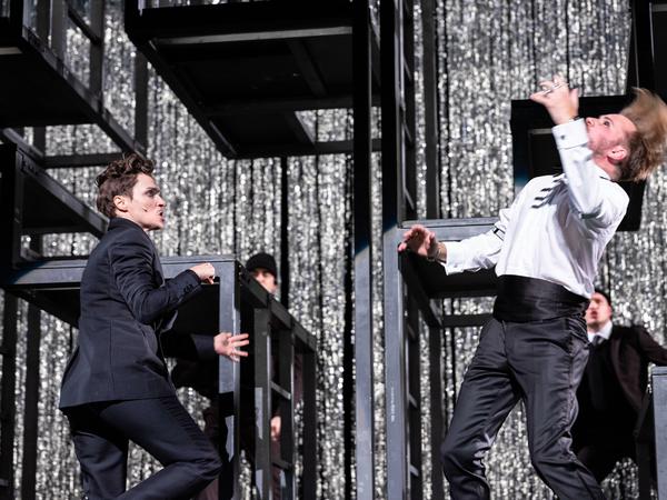 Der Bühnenaufbau von Rebecca Ringst stellt Ansprüche. Ein abendfüllendes Klettergerüst, eine riesige Regalwand – da muss man als Akteur schwindelfrei sein und sehr gelenkig. Da steigen und stellen sie einander nach, und solche Kletterübungen nehmen dann auch manchmal das Tempo heraus.