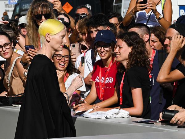 Solidarität und Glamour schließen einander nicht aus. Beim prominent besetzten Panel wird auf den QR-Code für Spendenüberweisungen hingewiesen, Catherine Deneuve hatte sich schon zu Festivalbeginn eine kleine ukrainische Flagge an ihre Bluse geheftet, Tilda Swinton erscheint mit gelb gefärbtem Kurzhaar auf dem Lido – so trägt sie die halbe Fahne auf dem Kopf. Und Moderator Volodymyr Ostapchuk, den man in der Ukraine genau wie Präsident Selenskyj als Comedian kennt, bedankt sich bei der Biennale für die Ausladung der Russen.
