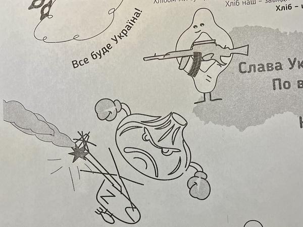 Man könnte im Puri Chveni eine Film-Noir-Szene drehen. Die Beleuchtung ist etwas gedämpft, wirkt aber trotzdem elegant. Neben uns sitzt ein junges Pärchen, eine Brünette und ihr Begleiter in Militäruniform, sie hält seine Hand. Auf der Papiertischdecke vor mir ist eine Szene abgebildet, in der ein Chinkali, eine georgische Maultasche, gegen einen Z-Panzer kämpft.