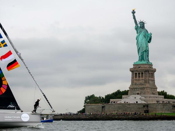 Greta Thunberg bei ihrer Ankunft in New York vor der Statue of Liberty.