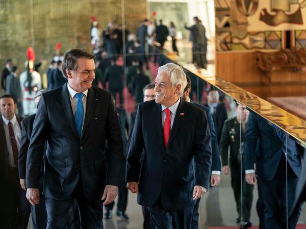 Brasiliens Präsident Jair Bolsonaro beim Staatsbesuch in Chile mit seinem chilenischen Amtskollegen Sebastian Pinera.