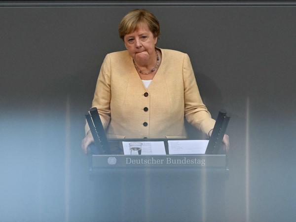 Sie wollte sich aus dem Wahlkampf heraushalten, doch die Lage lässt keine Prinzipien mehr zu. Im Bundestag wirbt die Kanzlerin für Armin Laschet – und erntet Empörung.