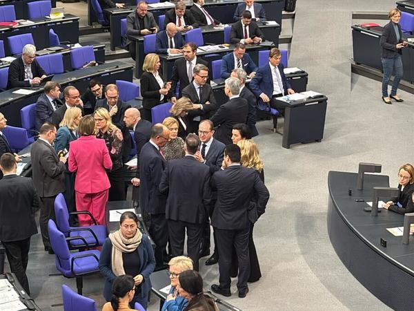 Friedrich Merz und Alexander Dobrindt stehen in einem großen Kreis mit weiteren Abgeordneten ihrer Fraktion. Die SPD-Fraktion fehlt weiterhin vollständig. Christian Dürr unterhält sich mit Merz. Grünen-Chefin Franziska Brantner und Bundeswirtschaftsminister Robert Habeck sind ebenfalls zurück im Plenarsaal und unterhalten sich. Sie scheinen, wie alle anderen, auf die Fortsetzung der Plenardebatte zu warten. Gegen 13 Uhr soll es weitergehen. (Np)
