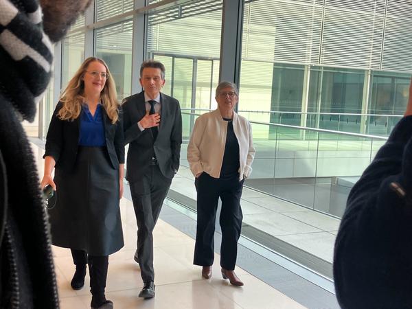 SPD-Fraktionschef Rolf Mützenich und die Fraktionsvorsitzenden der Grünen, Britta Haßelmann und Katharina Dröge sind zu den Sitzungssälen der Union herübergekommen, um mit deren Fraktionschef Friedrich Merz zu verhandeln.