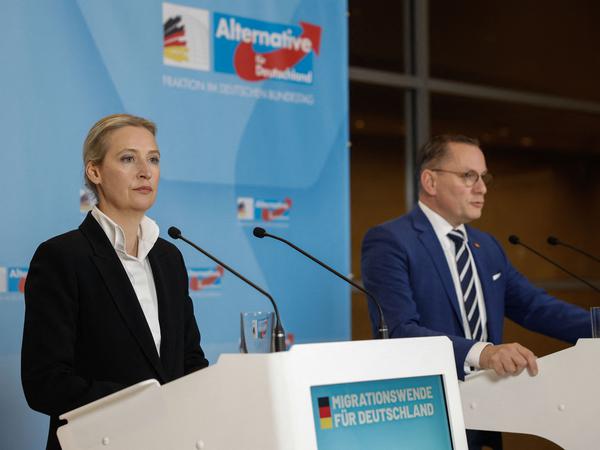 AfD-Statement auf der Fraktionsebene: Die Parteichefs Tino Chrupalla und Alice Weidel sprechen von Chaos im Parlament, fragen rhetorisch, wer eigentlich gerade CDU-Vorsitzender sei - Merz oder Merkel. Gelächter bei AfD-Abgeordneten im Hintergrund. „Das, was wir hier sehen, sind Brandmauer-Tote“, ruft Weidel. Merz habe seinen Laden nicht im Griff. Die CDU habe gerade ihren eigenen Kanzlerkandidaten abgesägt. (swi)