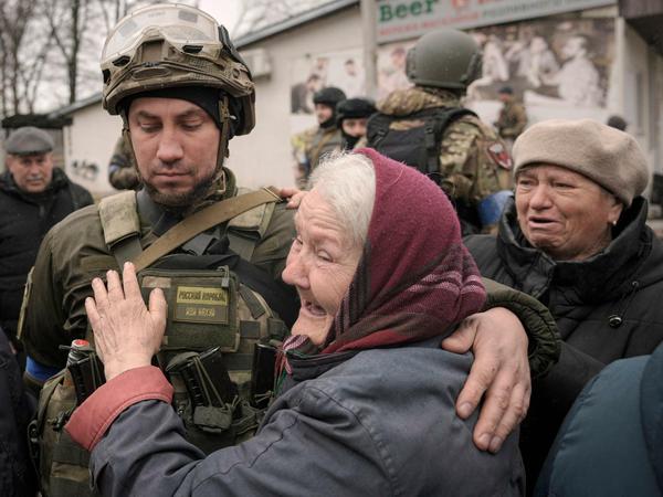 Am Sonntag standen Einwohner bei der Verteilung von Medikamenten und Hygieneartikeln Schlange, die ein Konvoi von Militär- und Hilfsfahrzeugen in die Stadt gebracht hatte. Die Menschen hießen die ukrainischen Truppen freudig willkommen. Bilder zeigten eine ältere Frau, die einen Soldaten umarmte.