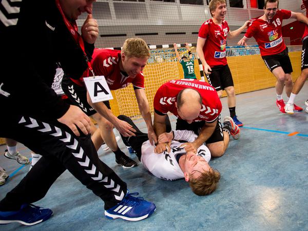 Mit drei Toren führte das Team des Potsdamer Trainers Silvio Krause. Und als beim Stand von 25:24 für den Brandenburgligisten Sekunden vor Schluss der letzte Altlandsberger Wurf geblockt wurde, kannte der Jubel keine Grenzen mehr. Krause schlug die Hände vors Gesicht und rang nach Worten: „Wahnsinn“, sagte er schließlich und lobte die Mentalität seiner Mannschaft. „Hier an zwei Tagen zwei Oberligisten zu schlagen, ist bockstark“, sagte Krause. Am Tag zuvor hatte der klassentiefste Endrundenteilnehmer bereits den LHC Cottbus im Halbfinale ausgeschaltet (24:21).
